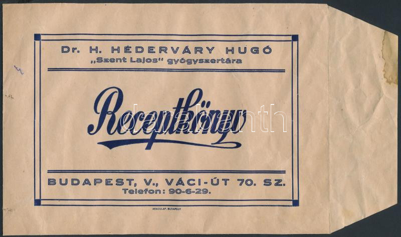 Dr. H. Héderváry Hugó "Szent Lajos gyógyszertárának" receptkönyv borítékja