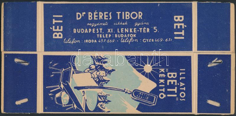 Dr. Béres Tibor vegyészeti cikkek gyára. Illusztrált kartondoboz. cca 20x10 cm.