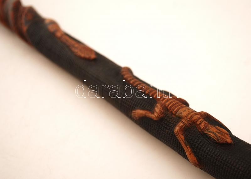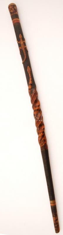 Hüllőmotívumos, gazdagon díszített fa sétabot, h: 86,5 cm