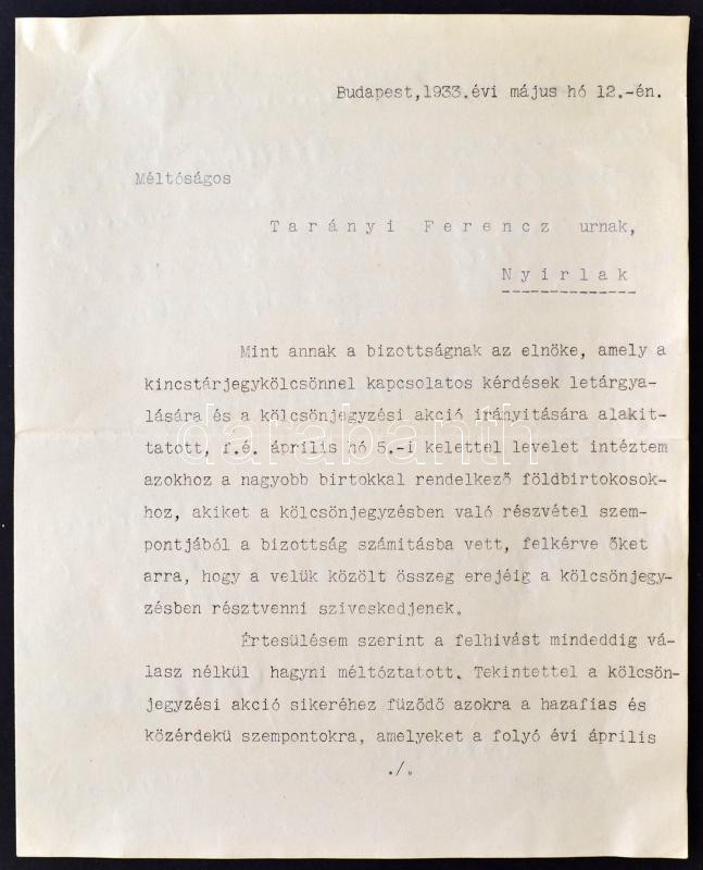 Description: 1933 Károlyi Gyula (1907-1942) politikus saját kézzel aláírt levele, melyben államkölcsön felvételére hív fel önkéntesen, hogy a nagybirtokosok elleni támadások élét el lehessen venni. Ceruzás váasz írással a hátoldalon