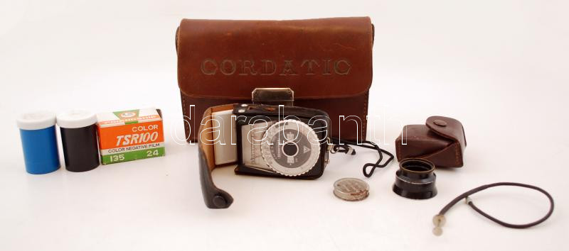 Fotós kellékek: fénymérő, film, stb., bőr tokban