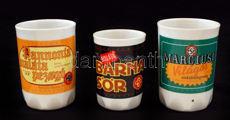 3 db retró motívumos Zsolnay porcelán emlékpohár, matricásak, jelzettek, apró kopásnyomokkal, különböző méretben