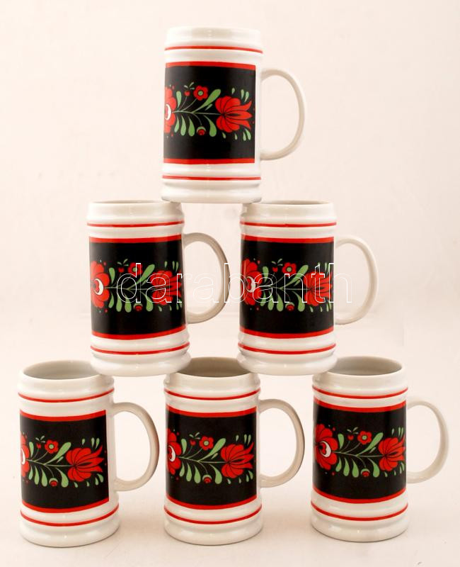 6 db kisméretű Hollóházi korsó, matricásak, jelzettek, apró kopásnyomo...