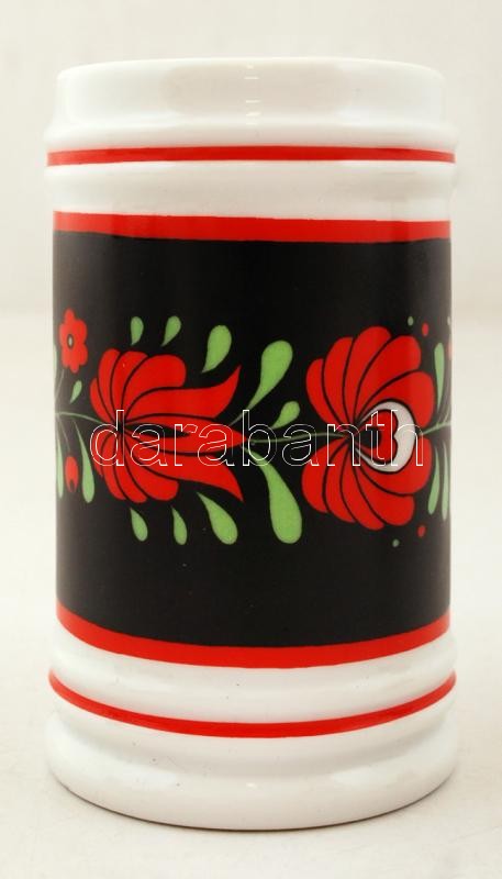 6 db kisméretű Hollóházi korsó, matricásak, jelzettek, apró kopásnyomokkal, d: 6 cm, m: 11 cm