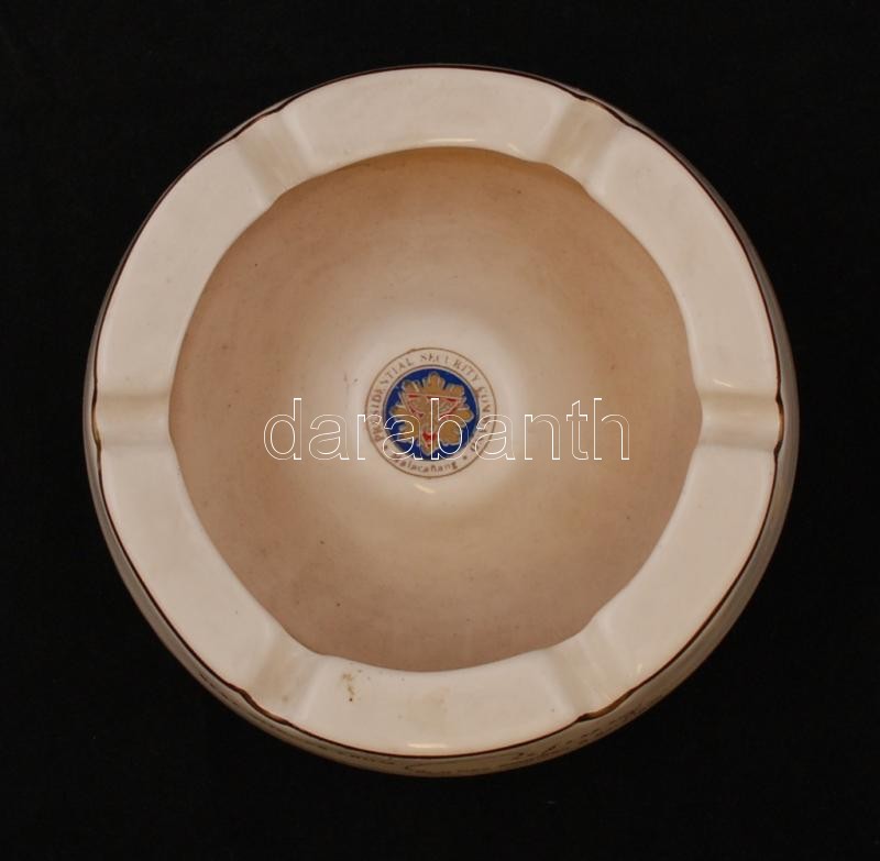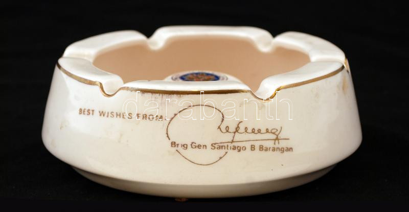Fülöp-szigeteki szuvenÃr hamutartó a Presidental Security Command jelvényével és Brig Gen Santiago S. Barangan, a testÅ‘rség vezetÅ‘je (1978-1986) nyomtatott aláÃrásával, matricás, jelzés nélkül, kis kopásnyomokkal, d: 15 cm / Porcelain suovenir ashtray from the Philippines, with the insignia of the Presidental Security Command and the printed signature of Brig Gen Santiago S. Barangan the commander of the PSC (1978-1986), unsigned, with small wears, d: 15 cm