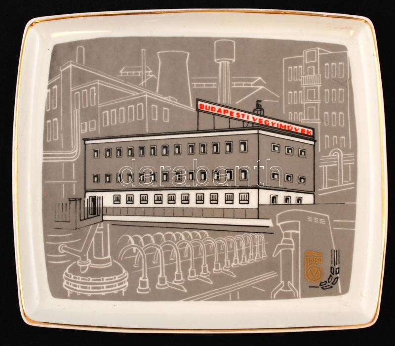 Hollóházi Budapesti Vegyiművek reklám tálka, matricás, jelzett, kopott aranyozás, 17×20 cm