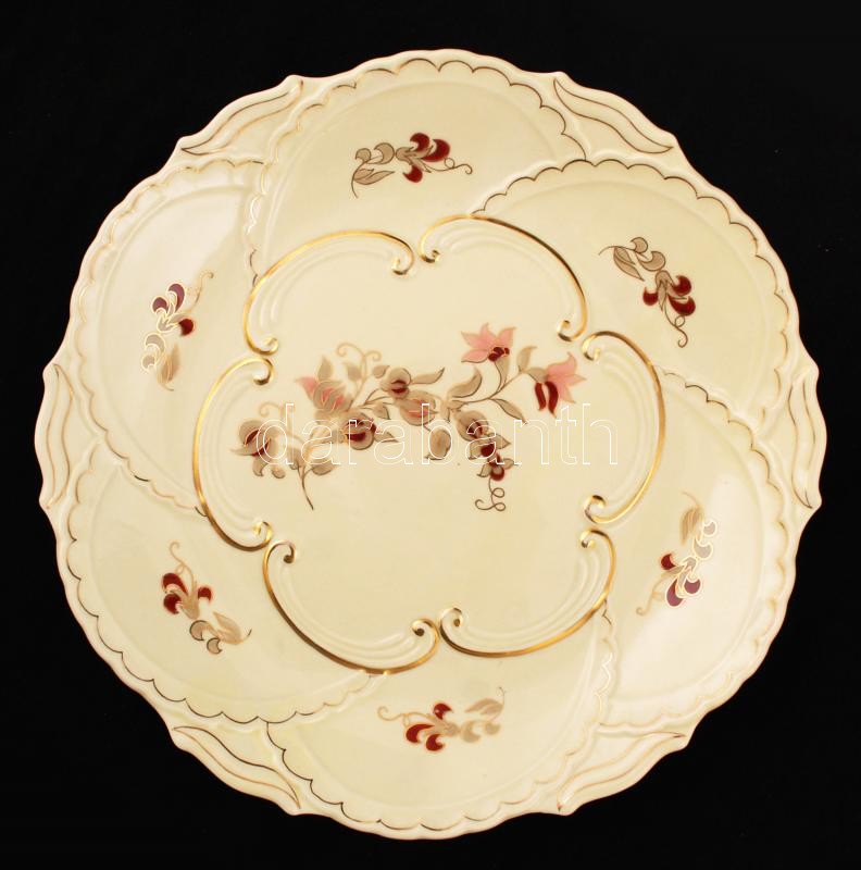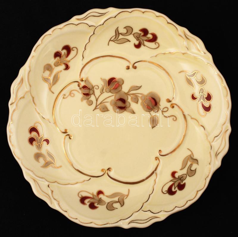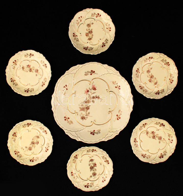 Zsolnay süteményes készlet: 6 db tányér, 1 db kínáló, kézzel festett, ...