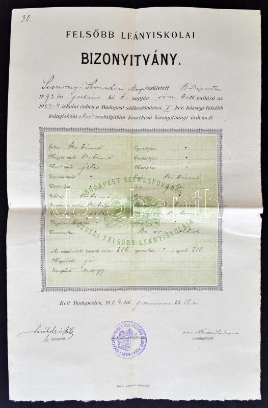 1907 Simonyi Semadam Margit (a miniszterelnök lánya) iskolai bizonyítv...