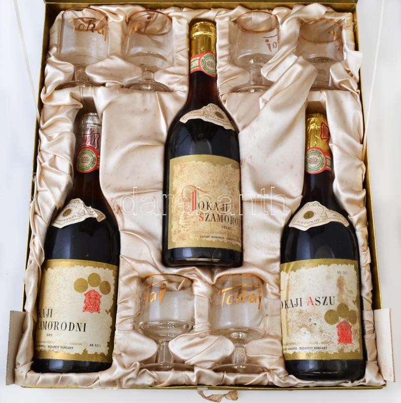 1964 Tokaji aszú és szamorodni, 3 palack, poharakkal díszdobozos kiad...