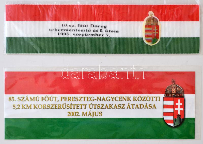 Description: 1995-2002 10. sz. főút Dorog tehermentesítő út I. szakaszának, valamint a 85. számú főút Pereszteg-Nagycenk közötti 5,2 km korszerűsített útszakasz átadása alkalmából készült avató szalag egy-egy darabja. 20x5 cm ill., 20x7cm.