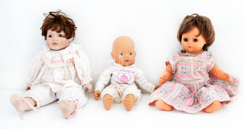 3 db porcelán, gumi, kaucsuk fejű baba, jelzettek, m: 32-46 cm