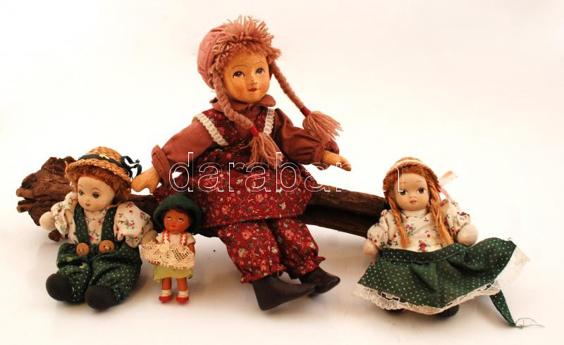 4 db különféle baba, 3 db porcelán, 1db gumi, egyik fa ágon ül, m:6-2...