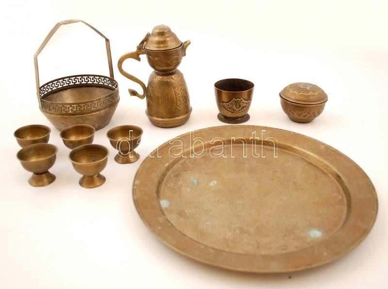 Argentor csésze tartó, üveg nélkül, aranyozott alpakka, jelzett, kopott, m:5 cm; valamint további réztárgyak: kiöntő, kosárka, tálca, stb., összesen: 9 db