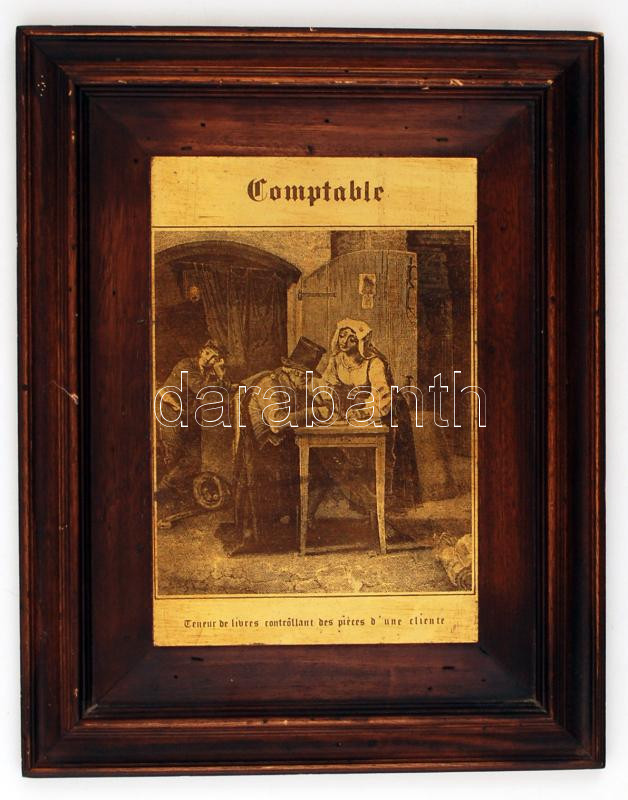 Comptable - teneur de livres contrôllant des pieces d'une cliente, rézmetszet után készült modern réz falikép, fa keretben, 30×20 cm