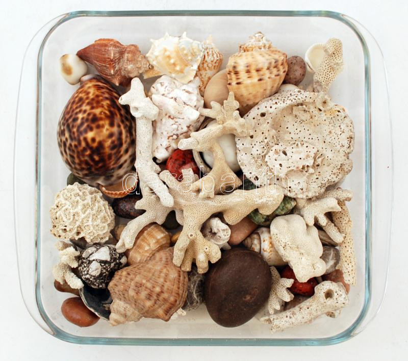 Korallok, csigák, kövek üveg tálban, 25x22x4 cm