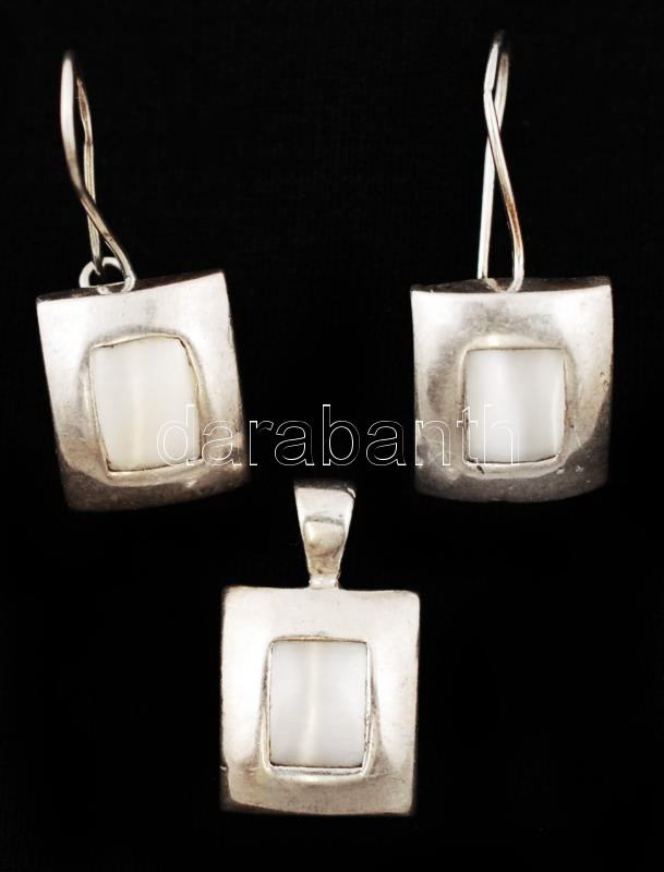 Mutatós gyöngyházberakással díszített fülbevalópár ezüst (Ag.), jelzett, bruttó:10g, hozzá illő medállal(összesen 3 db)