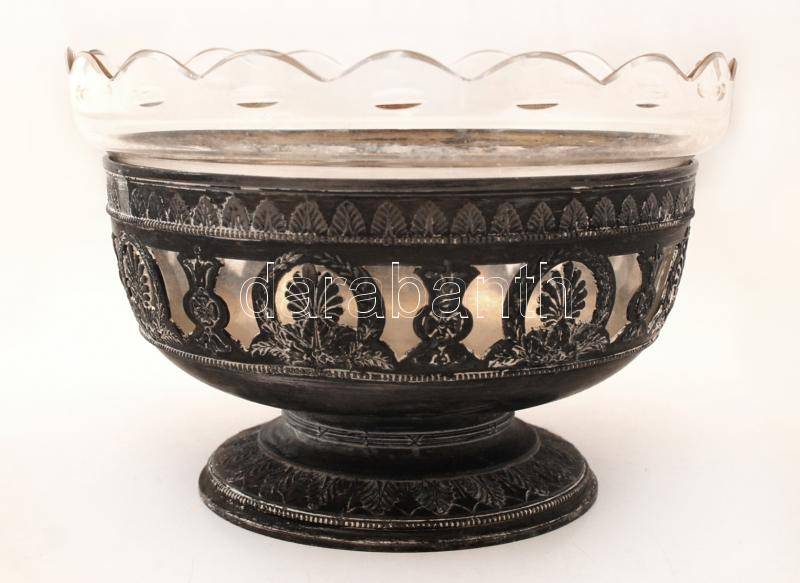 Üvegbetétes díszes alpakka kínáló, jelzett, d: 17,5 cm
