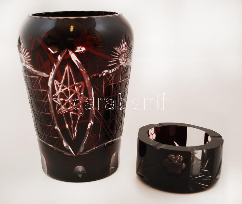 Kétrétegű bordó üvegváza és hamutó, metszett, apró csorbákkal, m: 4,5 ...