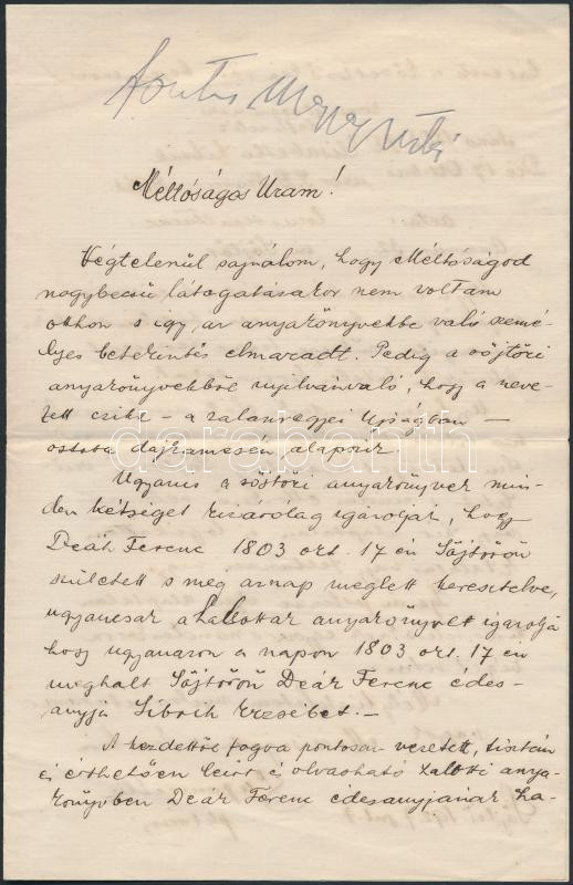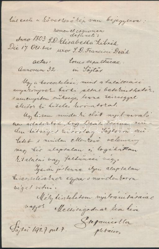 1927 A söjtöri plébános levele ismeretlennek, melyben egy akkoriban megjelent újságcikk állításait cáfolva megerősíti, hogy Deák Ferenc Söjtörön született, és édesanyja aznap halt meg. Idéz a halotti anyakönyvi kivonatból. 2 beírt oldal.
