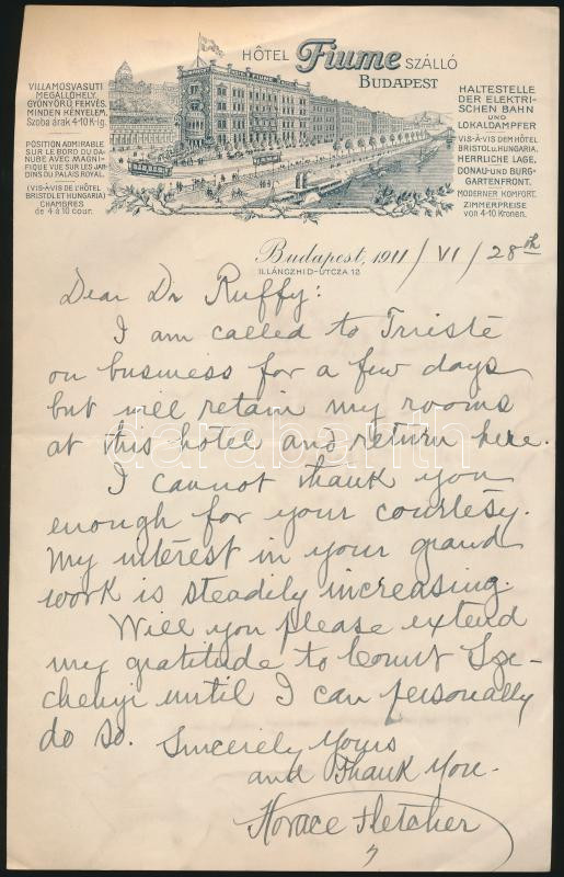 Horace Fletcher (1849-1919) amerikai táplálkozástudományi szakértő saját kézzel írt levele dr. Ruffy Pálnak (1854-1934) akadémikus, képviselő, a magyar gyermekvédelem megalapítójához. A Fiume szálló fejléces papírján, / Autograph letter of Horace Fletcher (1849-1919) food enthusiast of the Victorian era who earned the nickname "The Great Masticator"