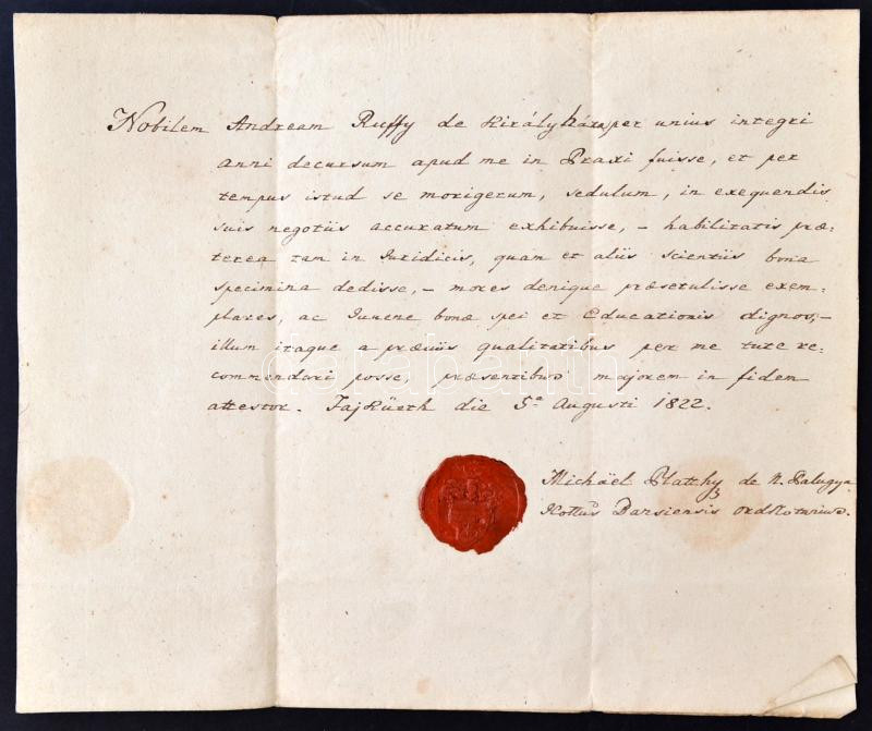 Platthy Mihály (1788-1853) kancelláriai tanácsos címeres pecséttel ellátott igazolása nagypalugyai Ruffy Andrásnak