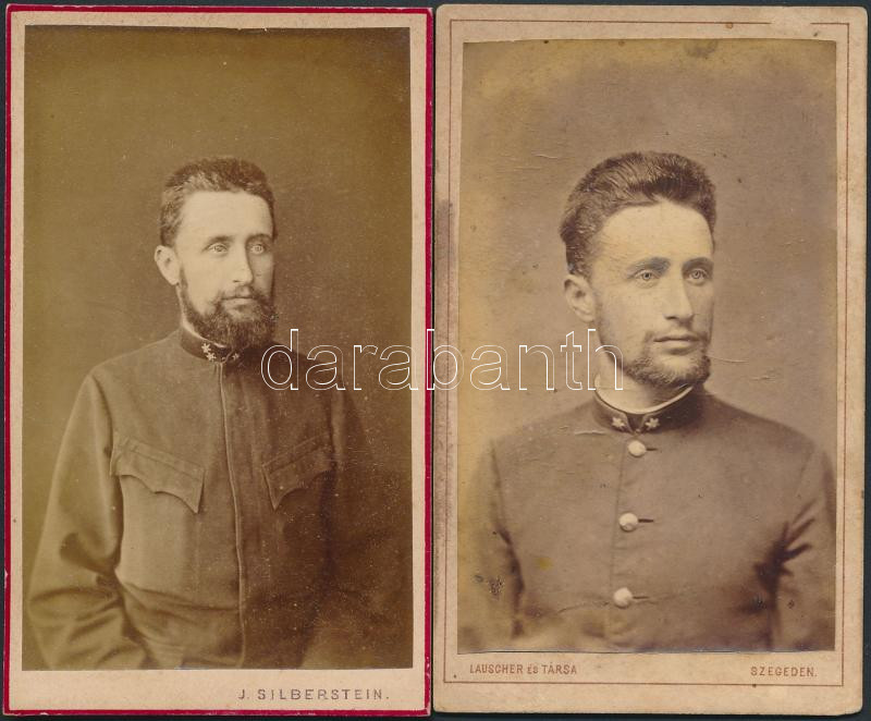 Description: 1877-82 Katona műtermi portréja Lauscher és Társa szegedi műterméből, keményhátú fotó, 10,5x6,5 cm, valamint katona műtermi portréja J.Silberstein veszprémi műterméből, keményhátú fotó, 11x6,5 cm