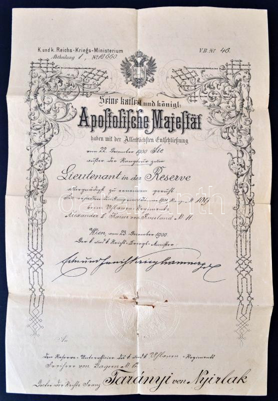 https://www.darabanth.com/en/262-Online-auction/262.0/Other-collectibles/Military~16/1900-Tartalekos-hadnagyi-kinevezes-hajtasok-menten-szakadassal-Leutnant-appointing-warrant~II1299605