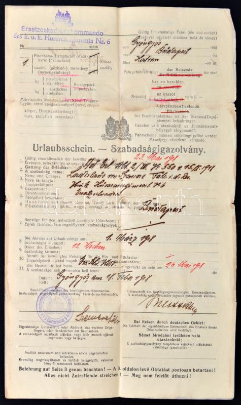 1918 Huszárezredben szolgált katona szabadságigazolványa / Freetime warrant for soldier