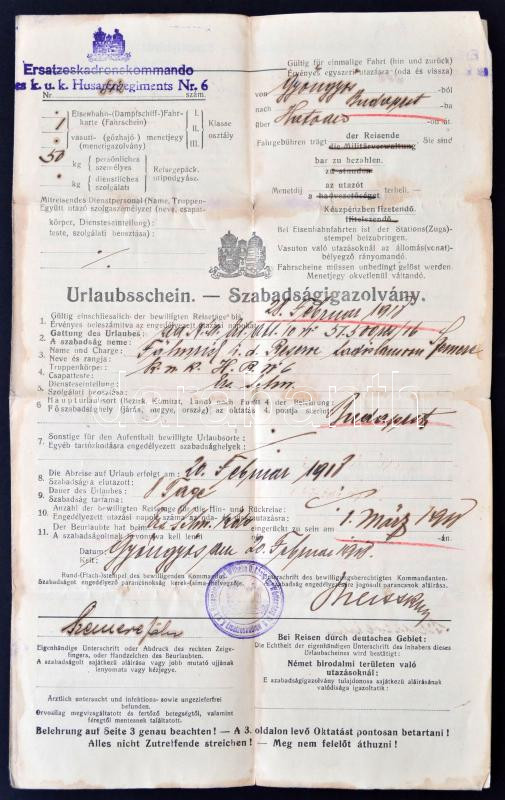 1918 Huszárezredben szolgált katona szabadságigazolványa / Freetime warrant for soldier