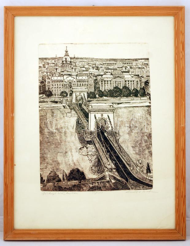 Kádas István (1941-): Lánchíd. Rézkarc, papír, jelzett, üvegezett kere...