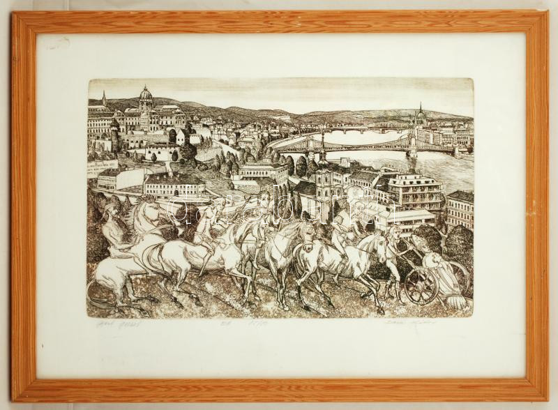 Kádas István (1941-): Szent Gellért kivégzése. Rézkarc, papír, jelzett, üvegezett keretben, 23×38 cm