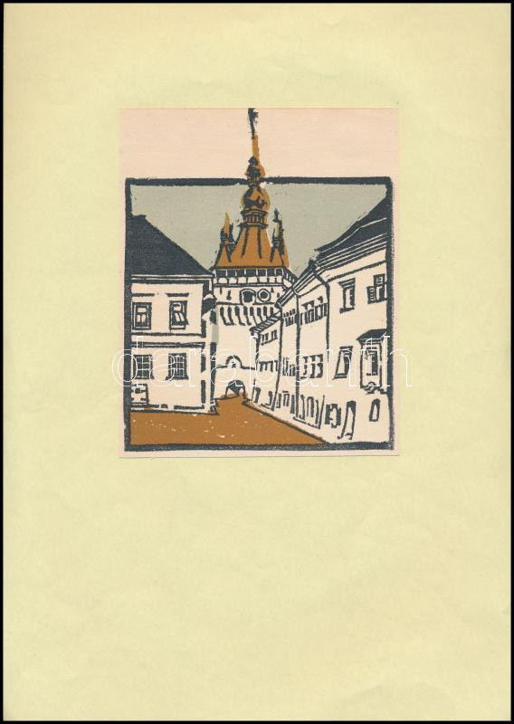 Kós Károly (1883-1977): Segesvár. Színes linómetszet, papír, jelzetlen, hátulján feliratozva, papírra ragasztva. 14×11 cm