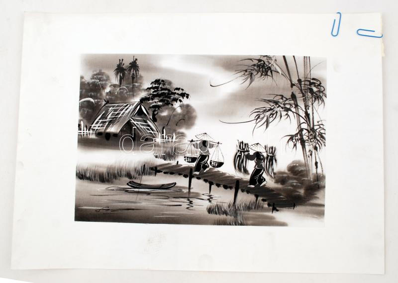Olvashatatlan jelzéssel: Falu a vízparton, távol-keleti életkép, vegye...