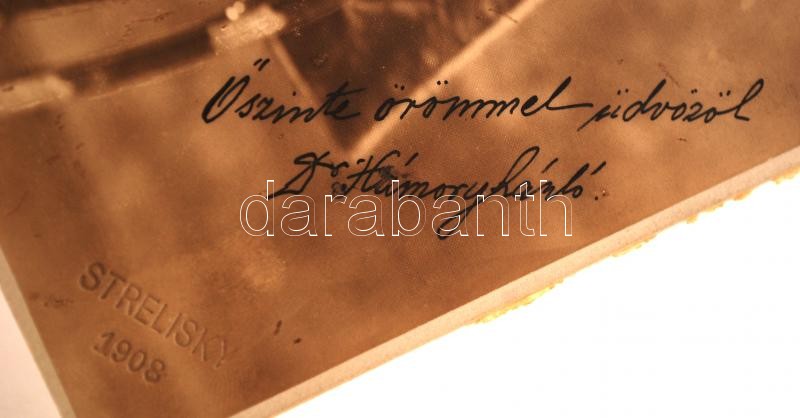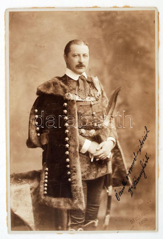 Description: 1901 dr. Hámory László (1868-?) földbirtokos Vízakna város képviselője, honvédhuszárhadnagy, a Hazai Automobil Rt elnöke díszmagyarban, Saját kezű aláírásával készített fotója. Strelisky fotó. 14x19 cm
