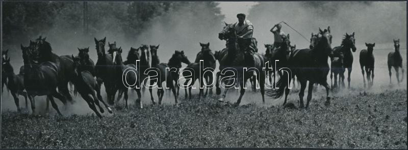 1964 Füredi Ferenc: Mezőhegyesi ménes, feliratozott vintage fotóművészeti alkotás, 8,5x24 cm