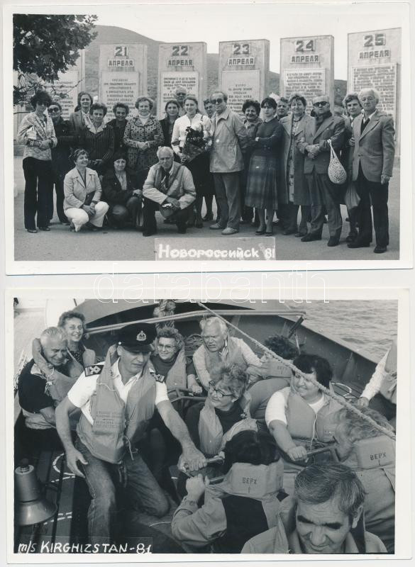 Description: 1981 8 db csoportfotó egy kirándulásról a Fekete-tenger keleti partján, Novorosszijszk-Szuhumi-Batumi (Grúzia) vonalán az MS Kirghizstan hajóval. A kirándulás egyik résztvevője Kállai Ferenc színművész volt. 18x12 cm.