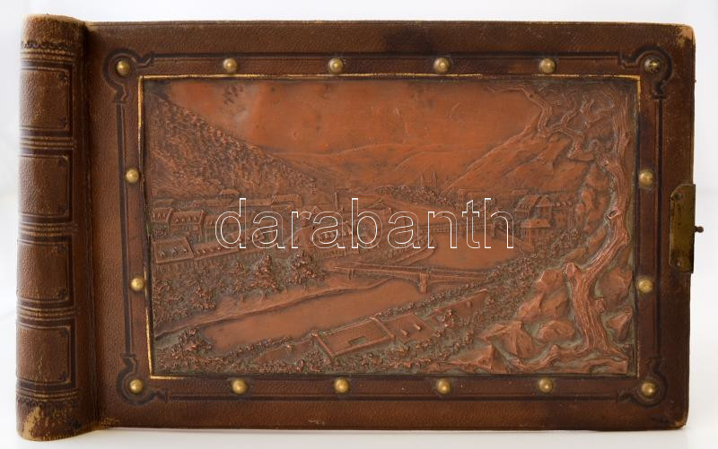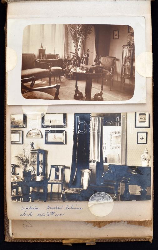 Description: cca 1870-1930 A bajsai Vojnich és a királyházai Ruffy család fotóit tartalmazó városképes plakettel díszített, kissé megviselt állapotú fotóalbum. 13 db feliratozott, azonosított fotó, palicsi, és budapesti képekkel, valamint a család főúri tagjairól készült fotók