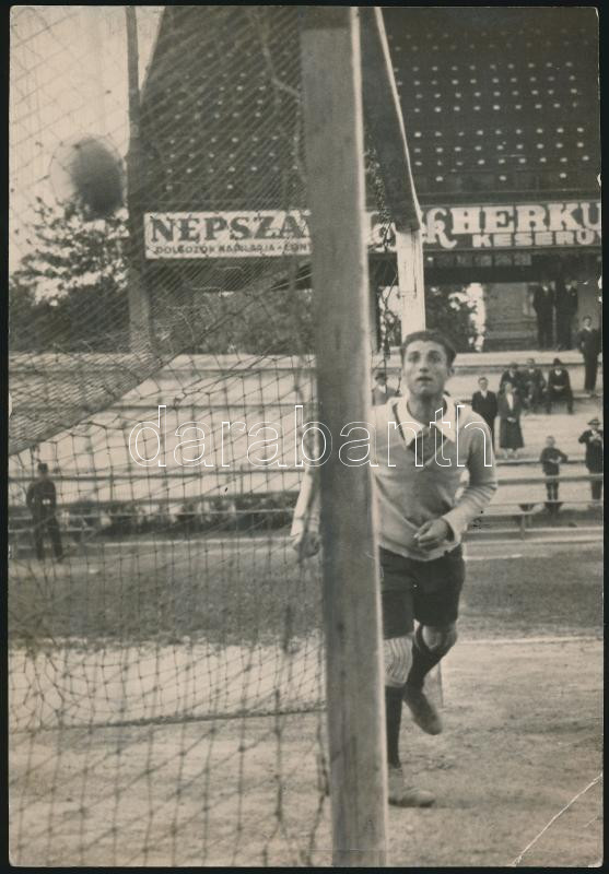 Description: cca 1920 Pataki Mihály gólt lő, Neuhaus portás csak szemmel tudta követni. Fradi - III. ker. TVE mérkőzés. Korabeli, hátulján feliratozott sajtófotó. 20x14 cm.
