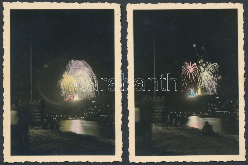 cca 1935 Budapesti tűzijáték, a Gellért hegyen Nagy-Magyarországot ábrázoló, irredenta dísszel. 2 db kézzel színezett fotó 6x9 cm
