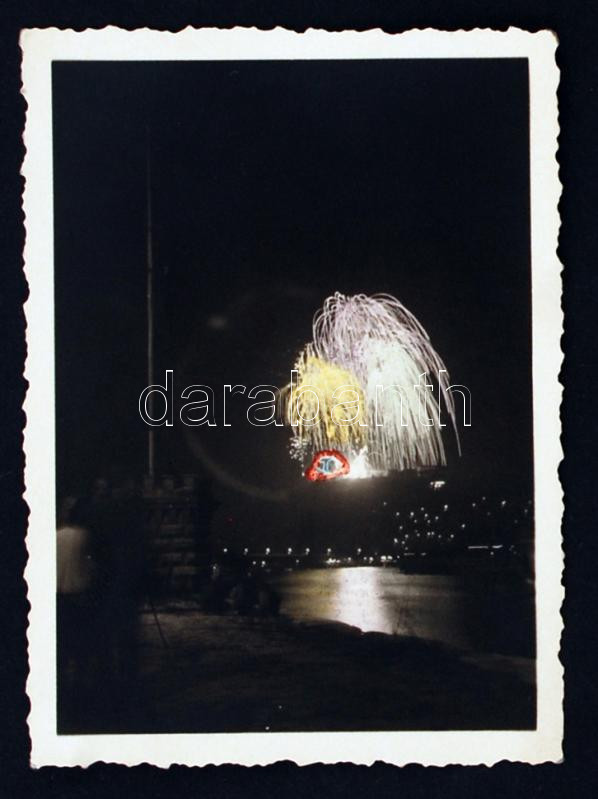 cca 1935 Budapesti tűzijáték, a Gellért hegyen Nagy-Magyarországot ábrázoló, irredenta dísszel. kézzel színezett fotó 6x9 cm
