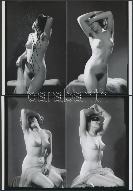 Description: cca 1950 Műterem-látogatáson Demeter Károly (1892-1983) budapesti fényképésznél, 8 db korabeli negatívról készült modern nagyítás finoman erotikus felvételekről 4 db 13x18 cm-es fotópapírra