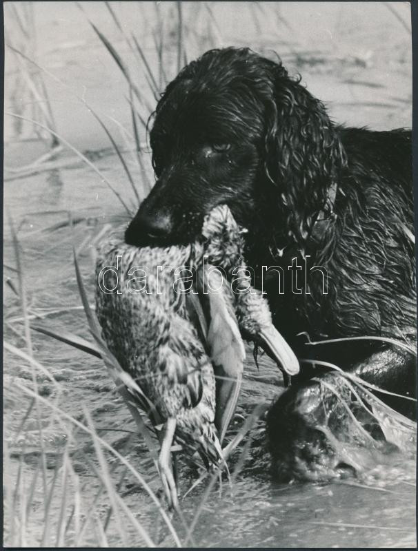 cca 1975 "Hozom..." Vadászkutya zsákmánnyal a nádasban. Bojár Sándor felvétele. Sajtófotó, hátoldalán pecséttel jelzett, feliratozva. 24x18 cm.