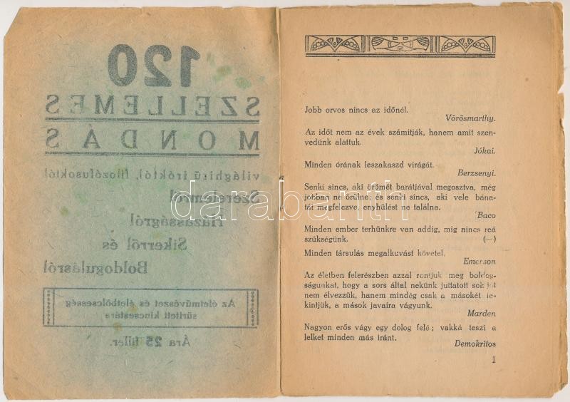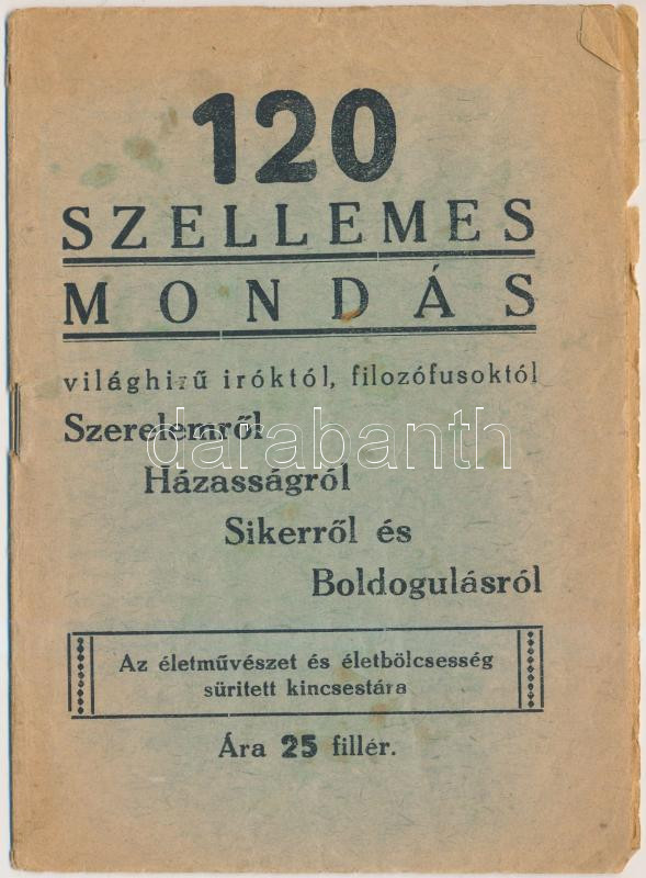 120 szellemes mondás világhírű íróktól, filozófusoktól. Szerelemről, házasságról, sikerrül és boldogulásról. Bp., é.n., Ujj István könyvnyomdája. 16 p. Kiadói papírkötésben.