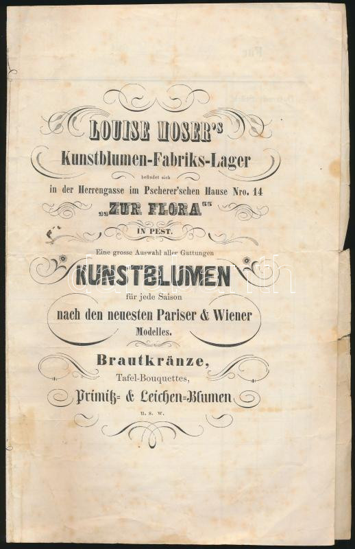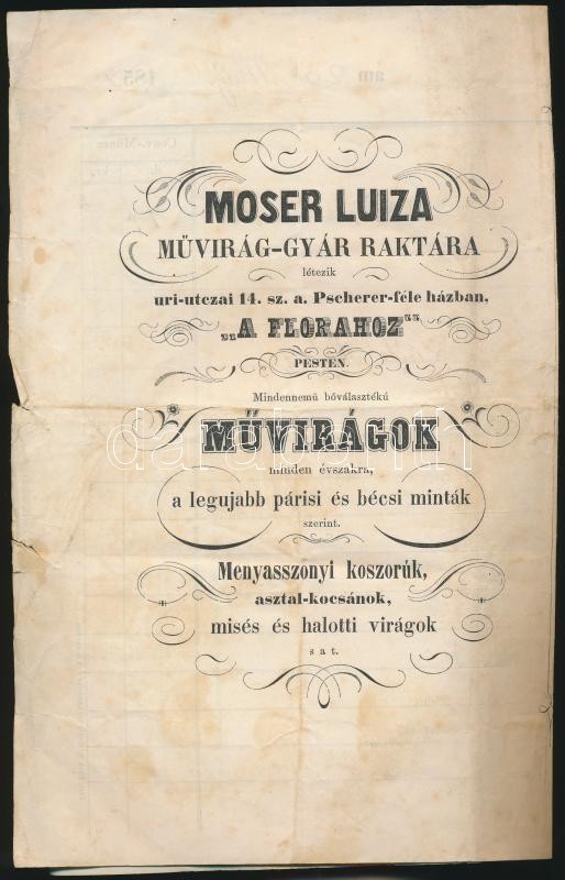 1859 Moser Luiza művirág-gyár raktára, nyomtatvány magyar és német nyelven, 22x28cm