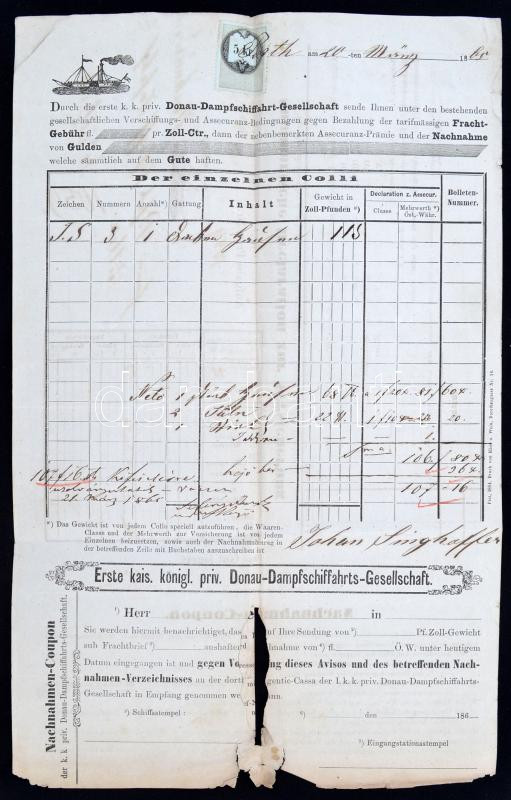 1865 Az Első Duna-gőzhajózási Társaság fuvarlevele. Kisebb sérüléssel....