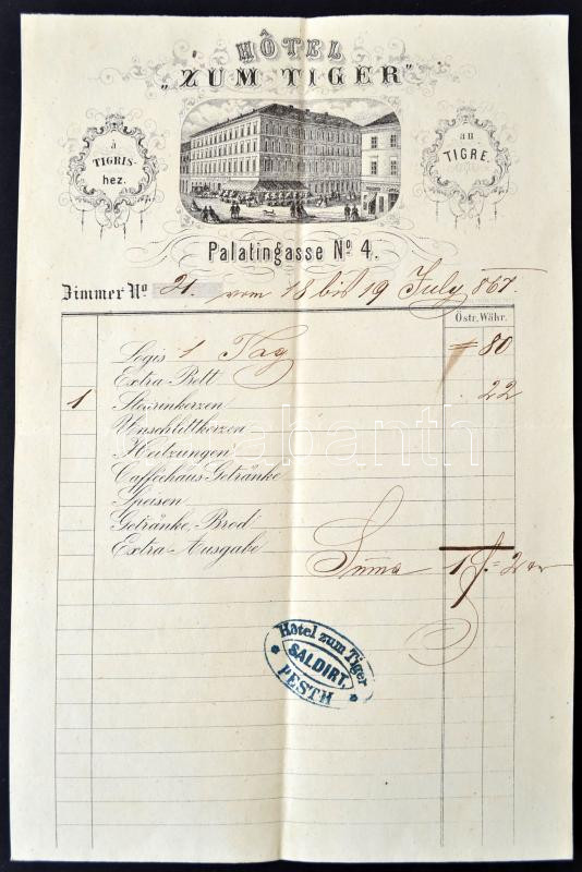 1867 Bp., V. A lipótvárosi tigris szálló és étterem grafikus számlája