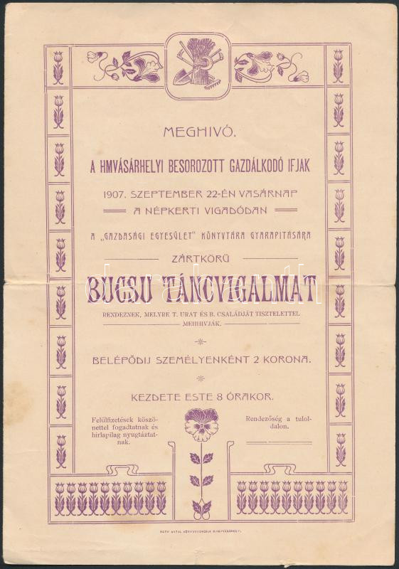 1907 Meghívó A hódmezővásárhelyi besorozott gazdálkodó ifjak búcsú tán...