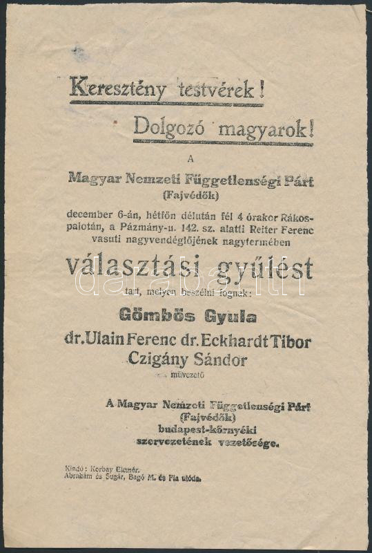 1926 A Magyar Nemzeti Függetlenségi Párt (Fajvédők) röplapja választási gyűlésről, melyen Gömbös Gyula is beszédet tartott. 24x16 cm.