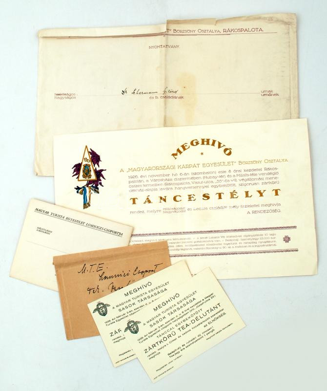 1926 Magyarországi Kárpát Egyesület nagyméretű meghívója, valamint néhány turistasággal kapcsolatos meghívó, boríték