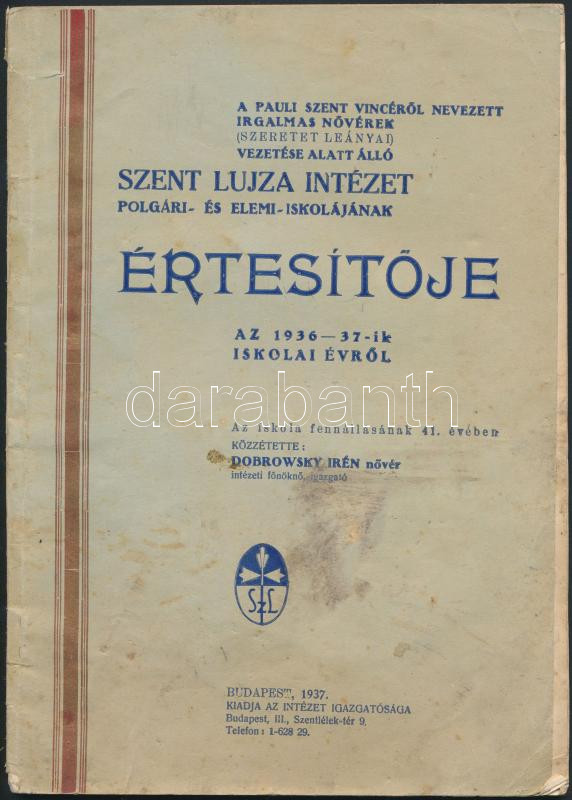 Description: 1937 A Pauli Szent Vincéről nevezett Irgalmas Nővérek (Szeretet Leányai) vezetése alatt álló Szent Lujza intézet polgári- és elemi-iskolájának értesitője az 1936/37-ik iskolai évről : az iskola fennállásának 41. évében / közzétette Dobrowsky Irén. Foltos papírkötésben.